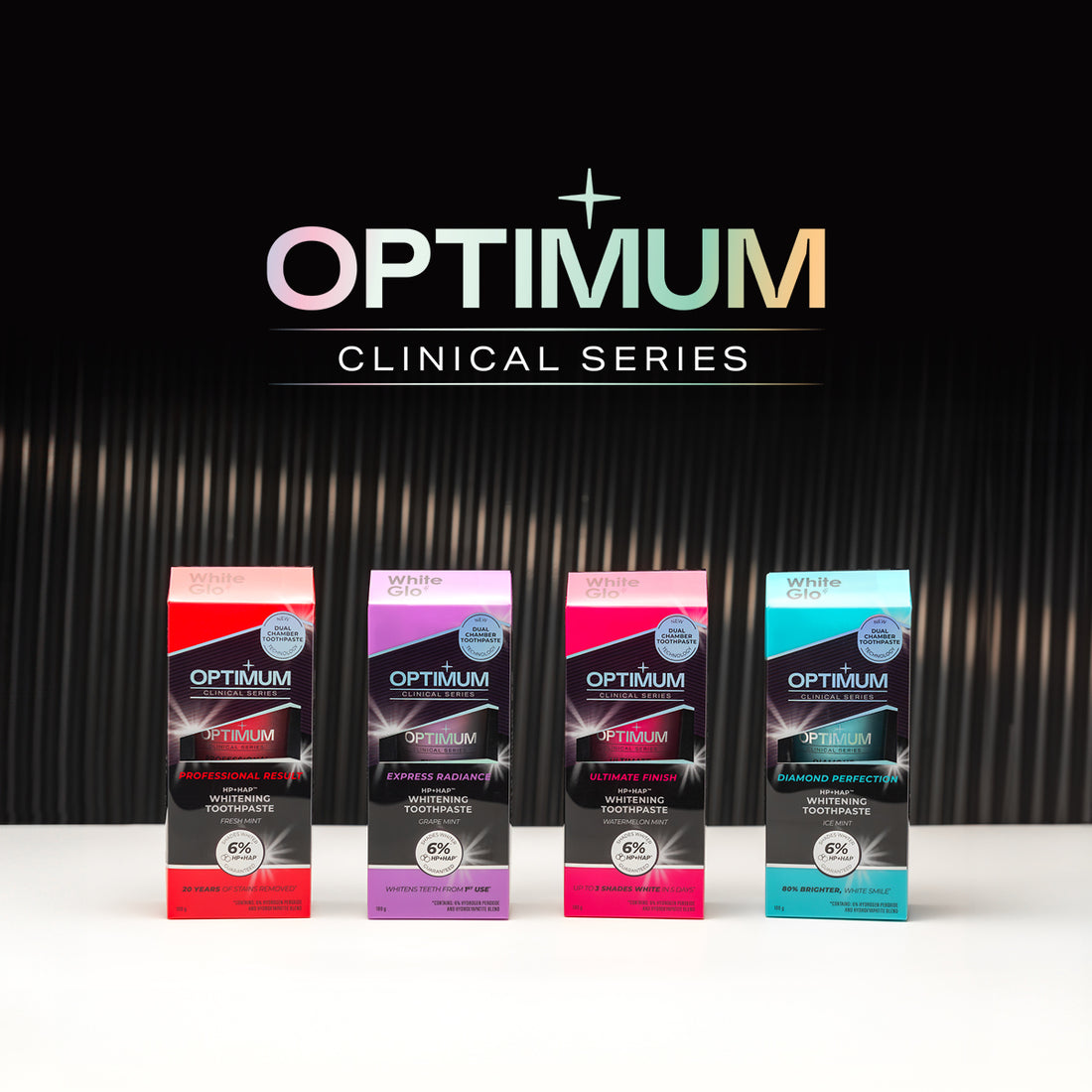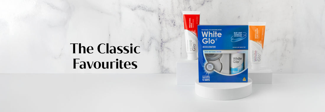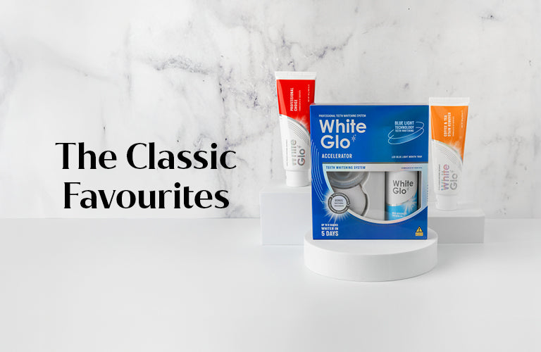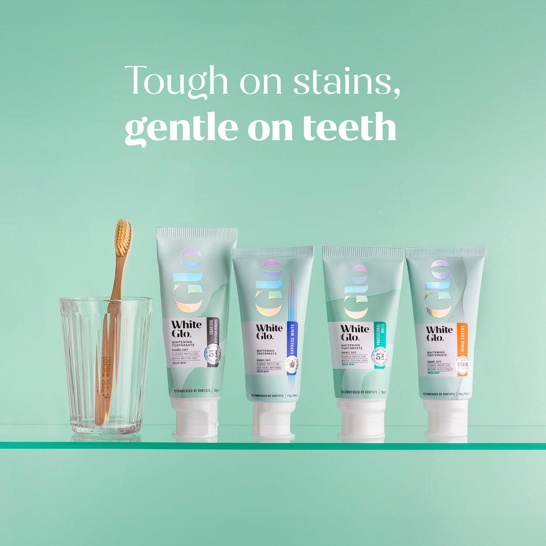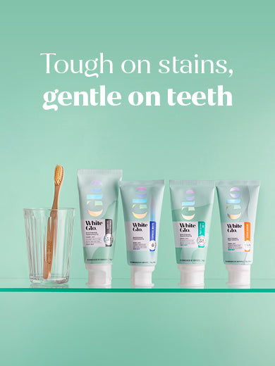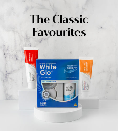 The Glo Range is White Glo’s most popular collection, featuring the latest whitening ingredients and a variety of products, including toothpastes, whitening kits, strips, and treatments. It provides professional-level whitening while being gentle on enamel and supporting overall oral health. On the other hand, the Classic Range was the original White Glo teeth whitening range and is designed to offer effective whitening at a more budget-friendly price. While it still delivers great whitening results and holistic oral care, it is a value option that includes a free toothbrush and floss with every toothpaste!
