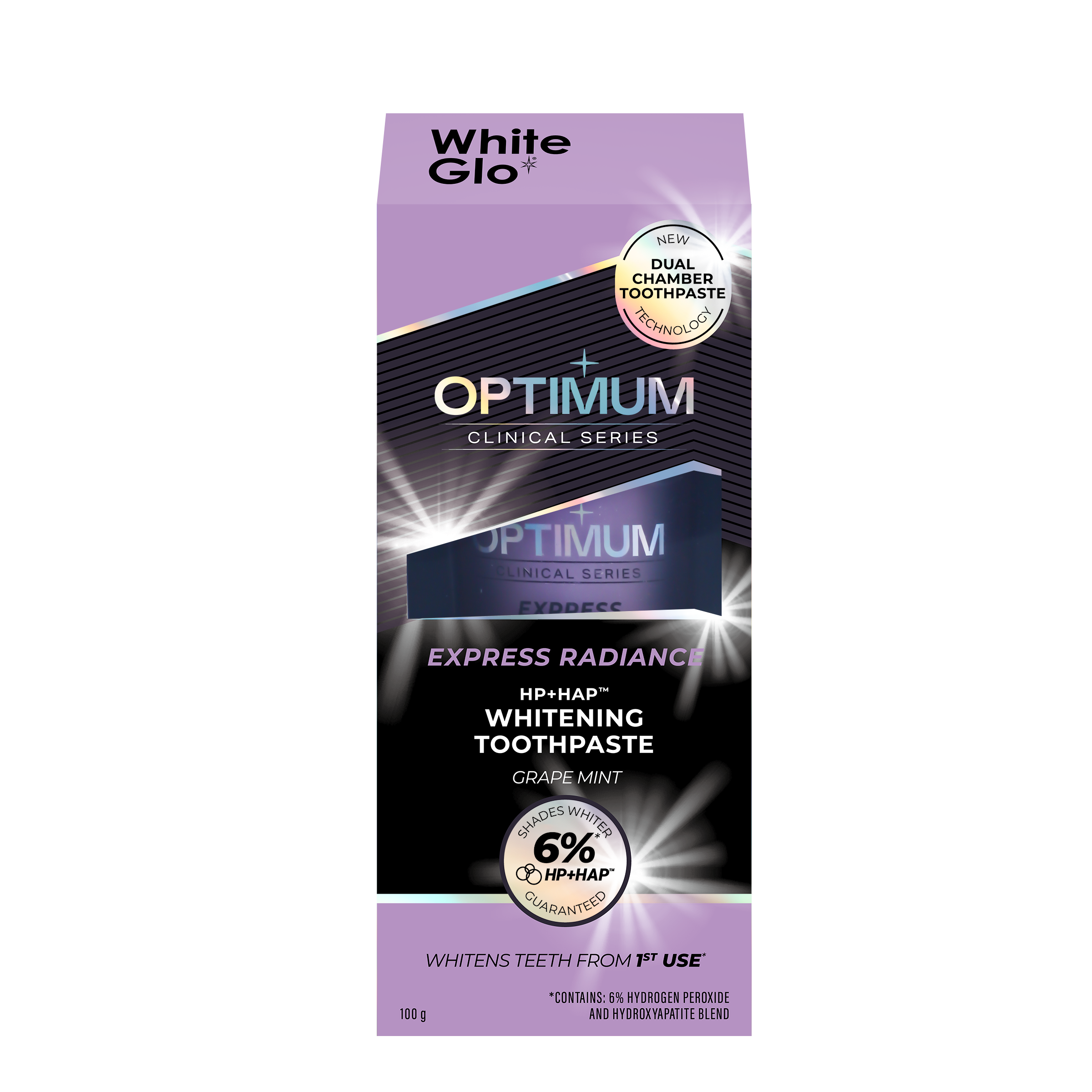 Featuring White Glo’s innovative Dual Chamber technology, Optimum Express Radiance Toothpaste whitens teeth from first use. Formulated with a specialised blend of 6% Hydrogen Peroxide and HAP gel, combined with a protective daily use toothpaste, this advanced new toothpaste delivers optimum teeth whitening results in the comfort of your own home. Express Radiance toothpaste also contains Micro Polishing Particles (Hydrated Silica + Sodium Bicarbonate) to buff away stains to see results from first use, and is grape mint flavoured for a burst of sweet and refreshing flavour.