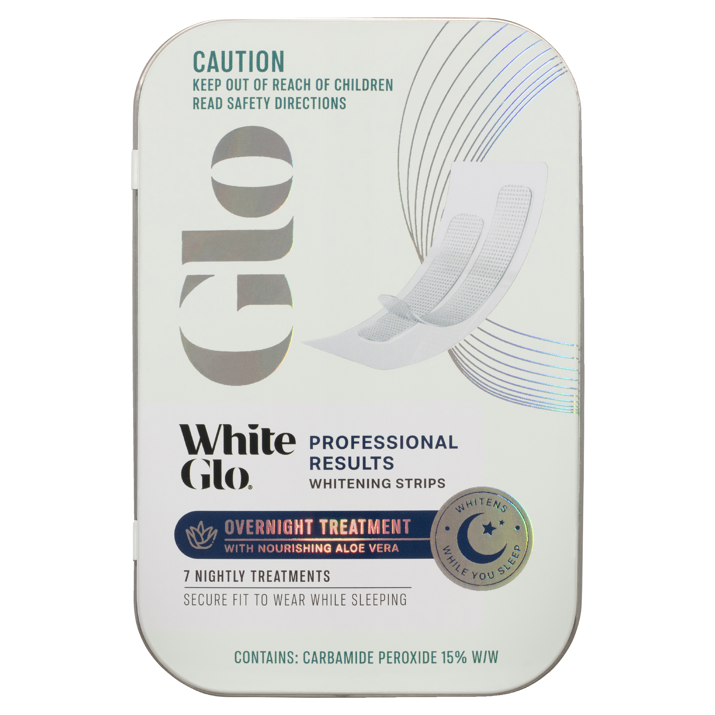 White Glo's Overnight Whitening Strips feature advanced technology, using the same enamel-safe whitening ingredients used by dentists for professional results. Introducing the most innovative and convenient way to whiten your teeth: White Glo's Overnight Treatment Strips. Formulated with natural aloe vera and peppermint oil, these strips nourish and whiten your teeth as you sleep. The specialised technology features slow releasing whitening agents to give you professional whitening results safely, over a period of 9 hours. The strips are also specially designed to fit securely to your teeth so they're safe to wear whilst sleeping. Use White Glo's Overnight Whitening Strips for 7 consecutive nights for best results.