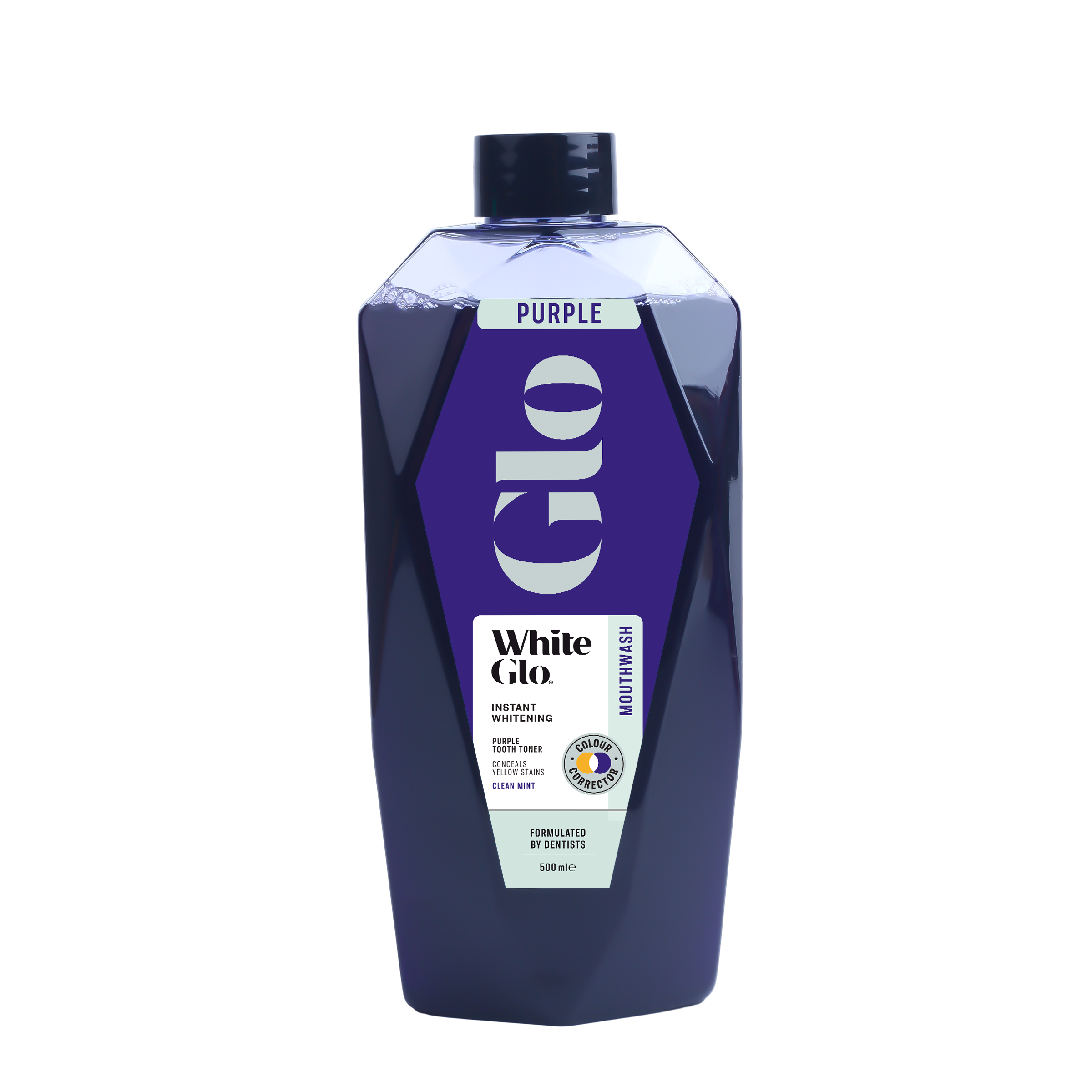 White Glo’s Purple Tooth Toner Technology featuring a specialised combination of red and blue dyes, to make purple colour correctors. These colour correctors counteract yellow stains on teeth enamel. White Glo have developed this technology into a whitening mouthwash format, designed for daily use. Use as a regular mouthwash, with an instant whitening result, concealing yellow stains and leaving your mouth feeling fresh and clean.